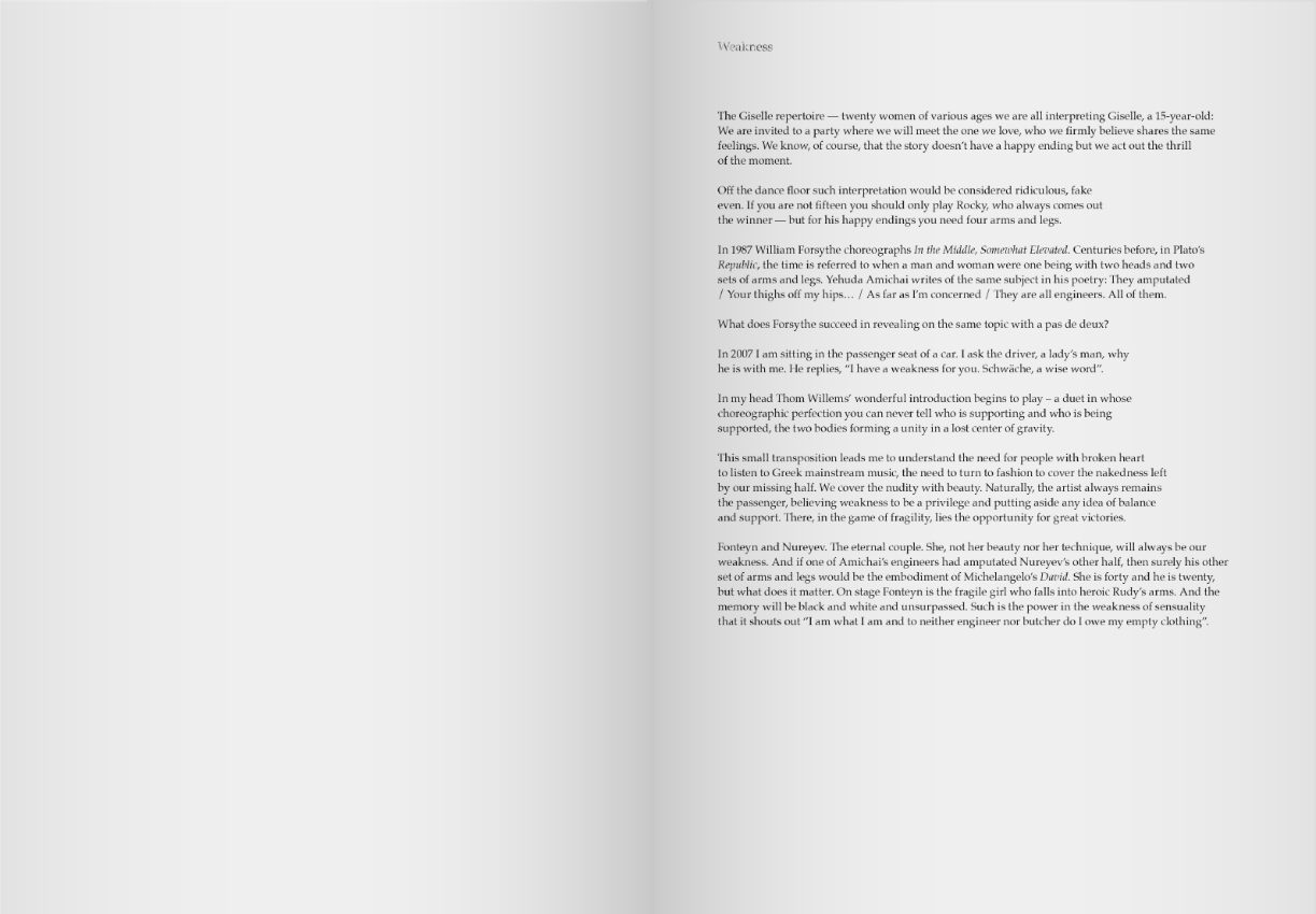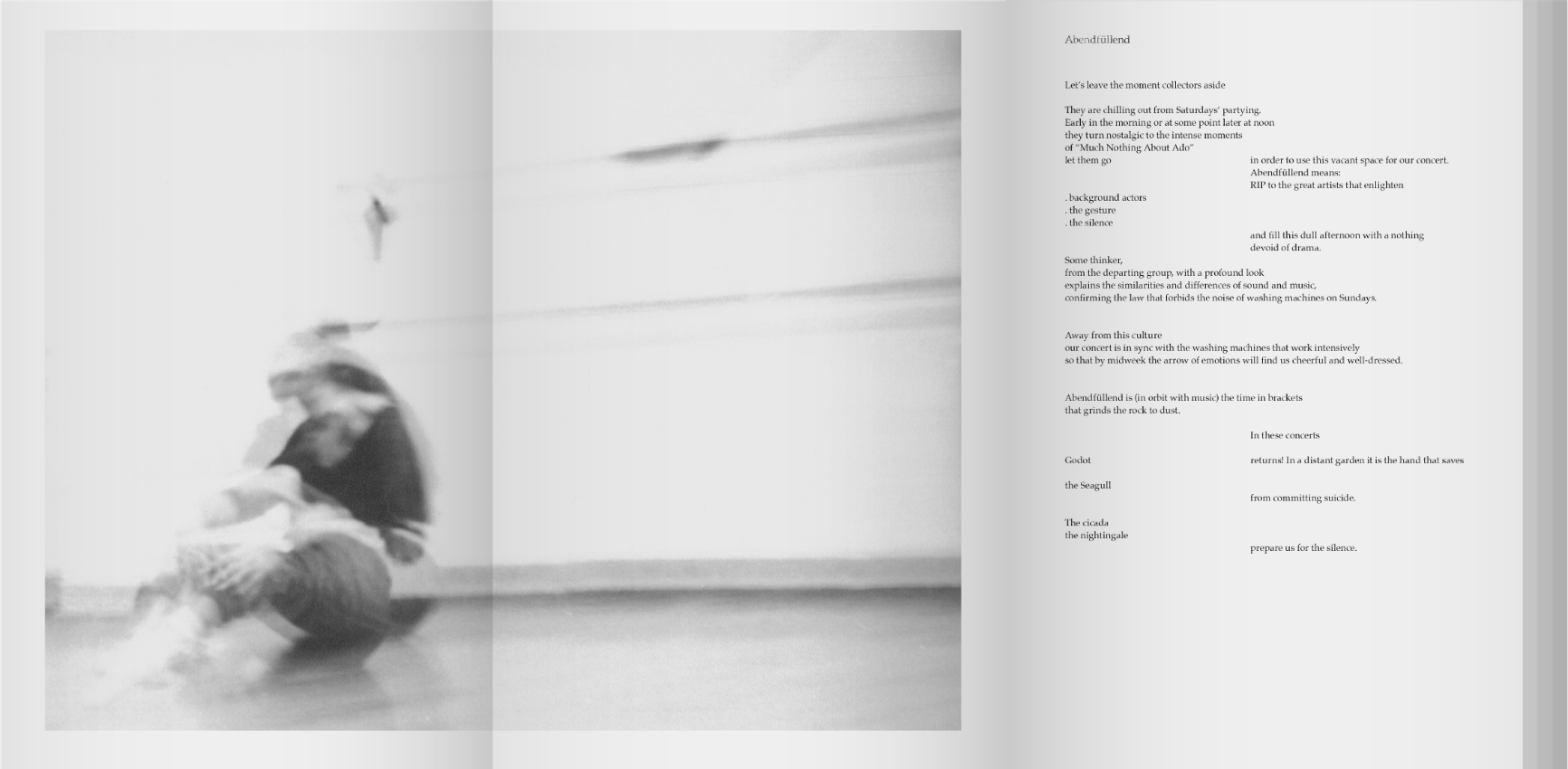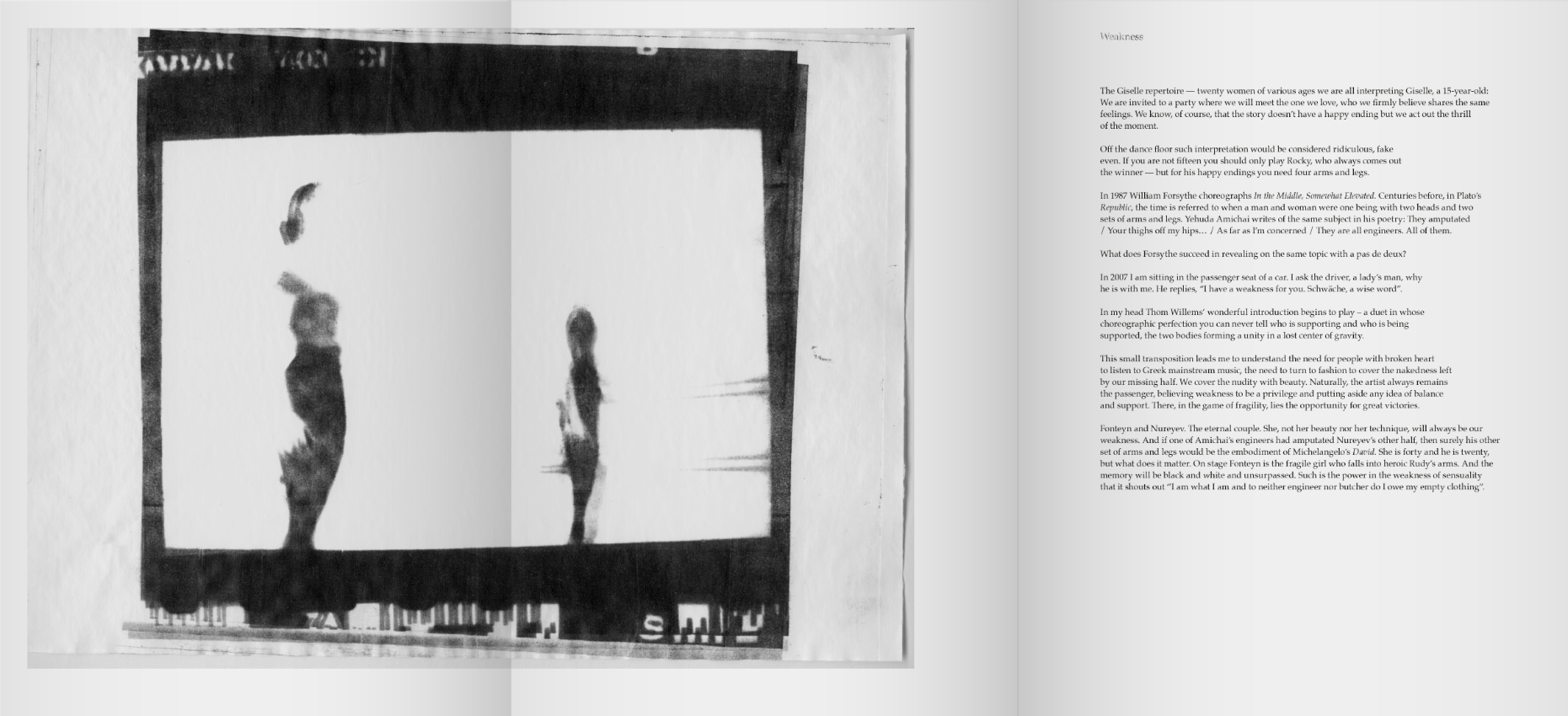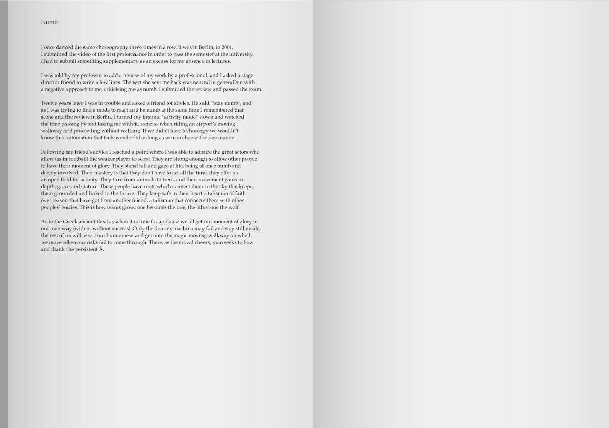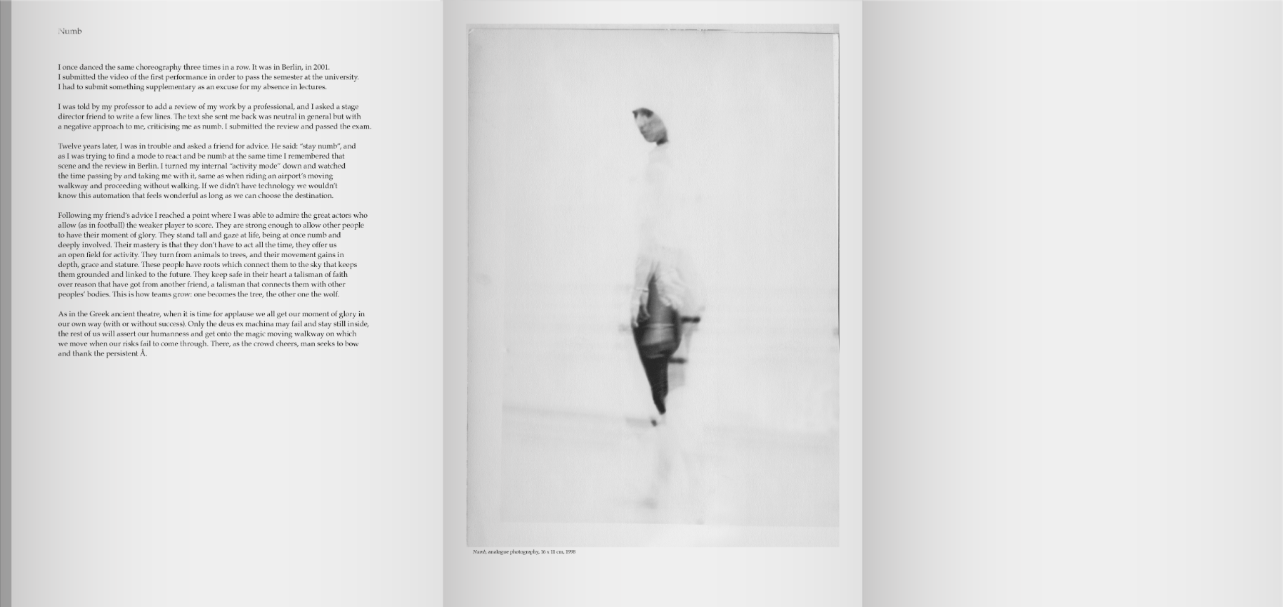 The quest is to document in an artist-book a work-in-project that combines image and text. This book describes how a visual artist and composer who spends her free time in dance schools and keeps record of the dancers’ movements keeps reprocessing the same material again and again as technology advances. She learns how to write as she collects and combines ‘writing exercises’ (ètudes), switching between arts, in the same way as one who is led to explain something while ‘lost in translation’ among every possible expression or memory, and ultimately succeeds in developing definitions.