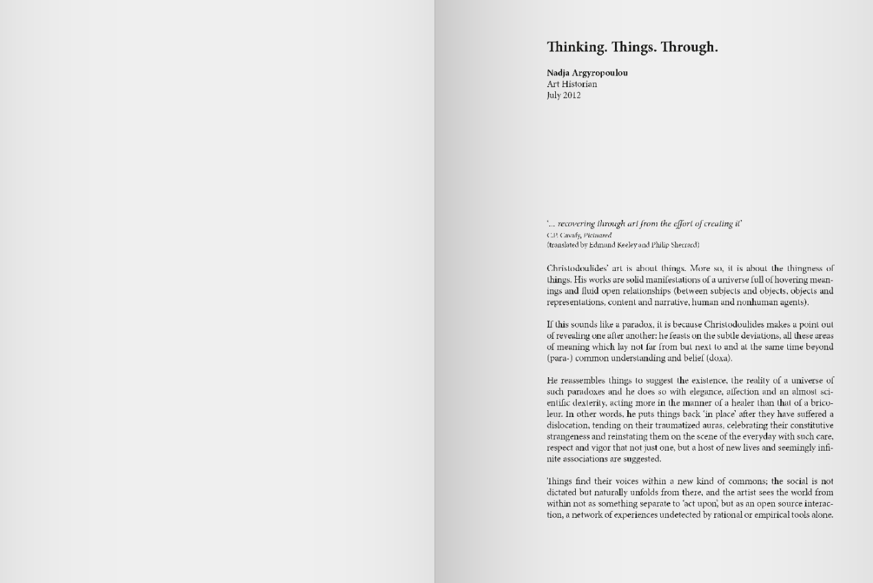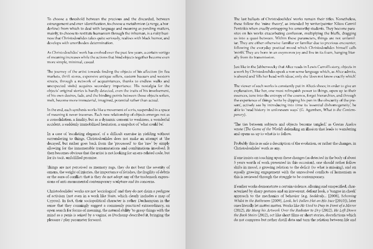 The book Works and Days of Hands was issued on the occasion of Savvas Christodoulides’ participation in the 30th Biennial of Sao Paulo. It contains twenty artworks chosen for this event by the curator of the Biennale, Luis Perez Oramas. The works not only comply with the theme of the Biennial, The Imminence of Poetics, but are also leading examples of the artist’s work: readymade items discard their state of expediency to become components in the artwork, thereby conforming to new ideological principles and values. The title of the publication is taken from a verse by T. S. Eliot wherein works and days, that is to say, time, are considered as obeying and being subject to the body. In other words, the work – and the instance of its creation – is the fruit of a gesture made by the body and, in consequence, of the mind.